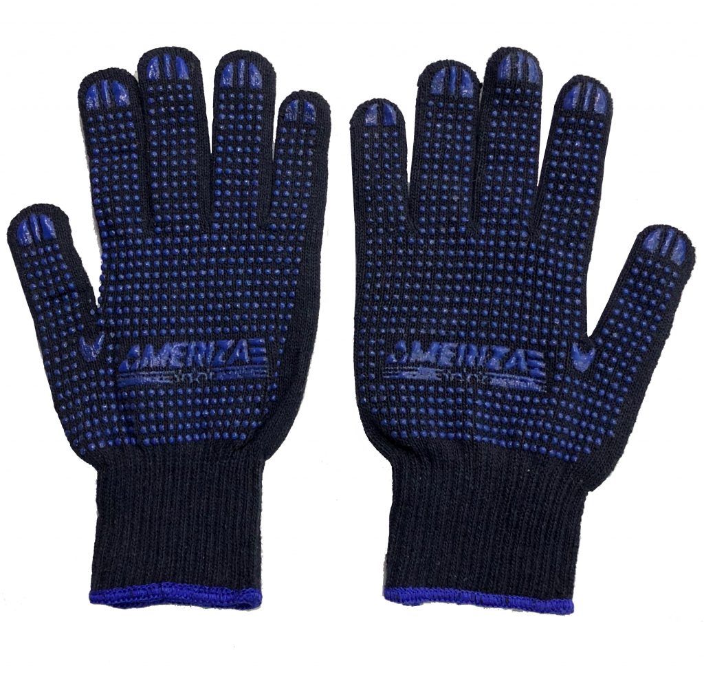 Cotton knitted gloves with double sided heavy-duty blue PVC dots.